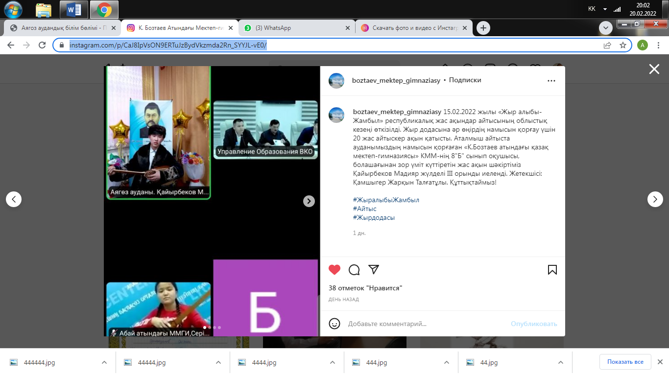 15.02.2022 жылы «Жыр алыбы- Жамбыл» республикалық жас ақындар айтысының облыстық кезеңі өткізілді. Жыр додасына әр өңірдің намысын қорғау үшін 20 жас айтыскер ақын қатысты. Аталмыш айтыста ауданымыздың намысын қорғаған «К.Бозтаев атындағы қазақ мектеп-гимназиясы» КММ-нің 8"Б" сынып оқушысы, болашағынан зор үміт күттіретін жас ақын шәкіртіміз Қайырбеков Мадияр жүлделі ІІІ орынды иеленді. Жетекшісі: Қамшыгер Жарқын Талғатұлы. Құттықтаймыз!