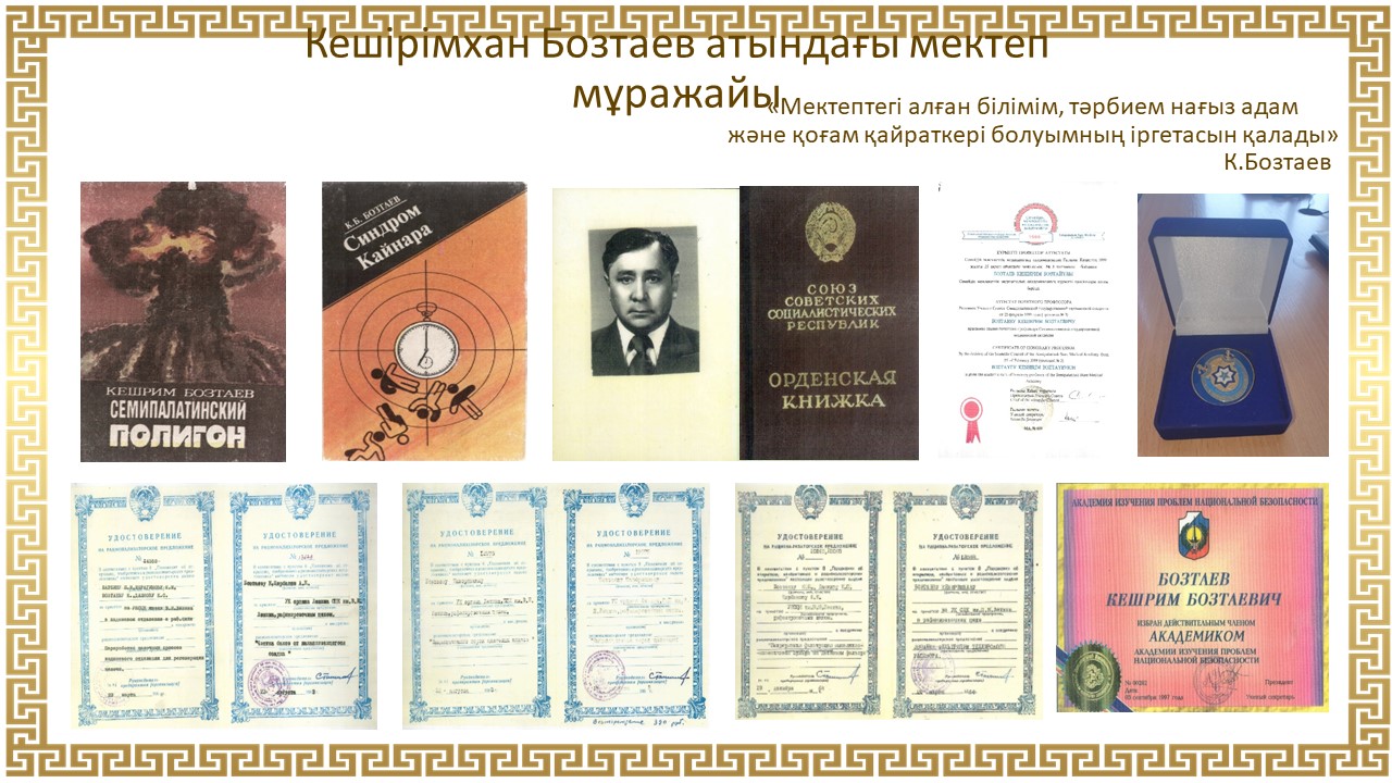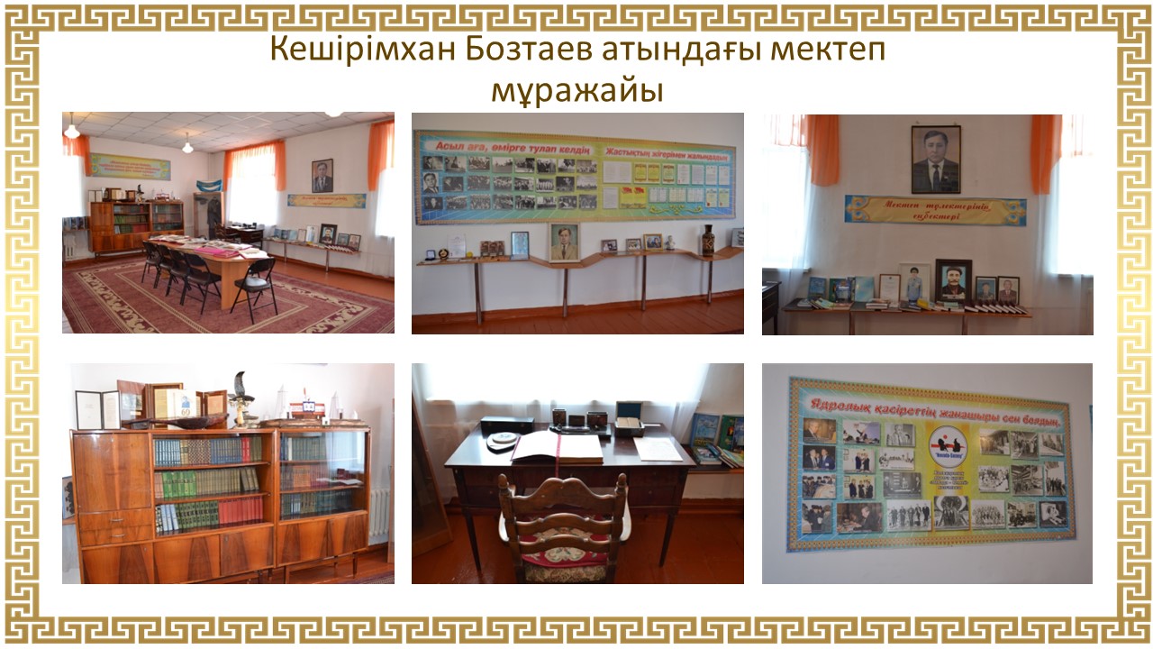 Мектепке Кешірімхан Бозтаевтың есімі берілгеннен кейін, мектебімізде арнайы мұражай да ашылды. Мұражайда Кешірімхан Бозтайұлының жеке кітапханасы бар. Онда 300-ден астам әдебиеттер: «Қайнар синдромы», «Семипалатинский полигон» кітаптары мен әлем әдебиеттері жинақталған. Сонымен қатар қоғам қайраткерінің қолданған заттары, мемлекеттік марапаттары, («Құрметті профессор» аттестаты 1999 жыл, «ҚР мемлекеттік күзет қызметі» медалі) алған медальдарын растайтын құжат көшірмелері (академик М.К.Янгель атындағы медаль, «Ленин ордені» төлқұжаты, «Еңбек Қызыл ту» ордені ), әр түрлі мекемелердің Кешірімхан Бозтайұлының 60 жылдық, 80 жылдық мерейтойымен құттықтау хаттары, сыйлықтары, мұражайға сыйға тартылған кітаптар, мектеп түлектерінің фотосуреттері сақталған. Биыл мектеп мұражайының ашылғанына 21 жыл толды.