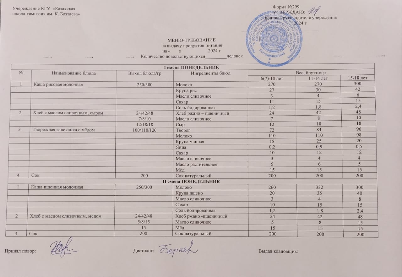 2024 жылдың 18 наурызында «К. Бозтаев атындағы қазақ мектеп-гимназиясы» КММ асханасының ас мәзіріне тексеру жүргізілді. Ас мәзіріне сай екі ауысымда да тамақ берілді. Тексеру барысында ас мәзірі талаптарға сай болды. Ас мәзірі қоса тіркеледі.