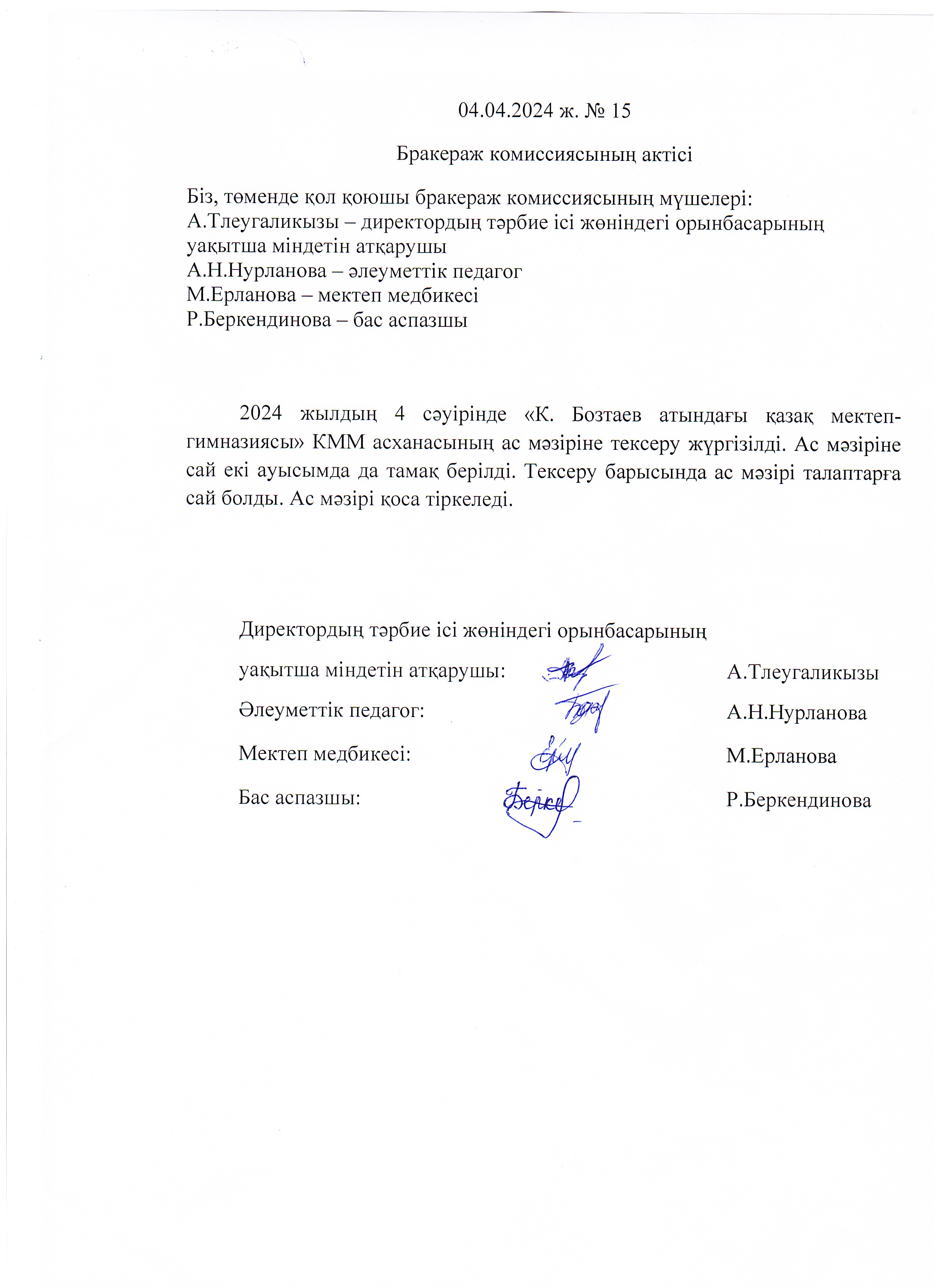 2024 жылдың 4 сәуірінде «К. Бозтаев атындағы қазақ мектеп-гимназиясы» КММ асханасының ас мәзіріне тексеру жүргізілді. Ас мәзіріне сай екі ауысымда да тамақ берілді. Тексеру барысында ас мәзірі талаптарға сай болды. Ас мәзірі қоса тіркеледі.