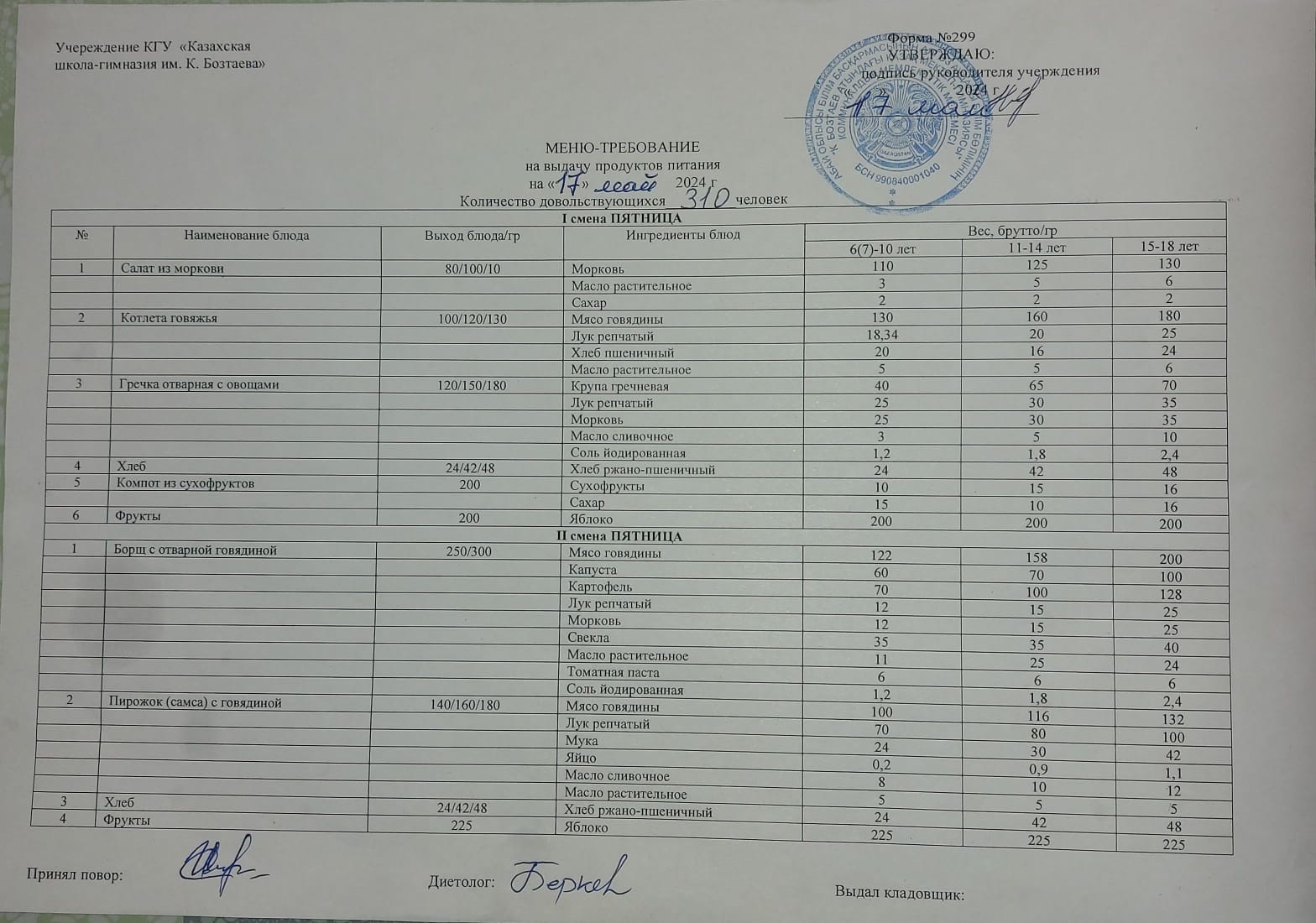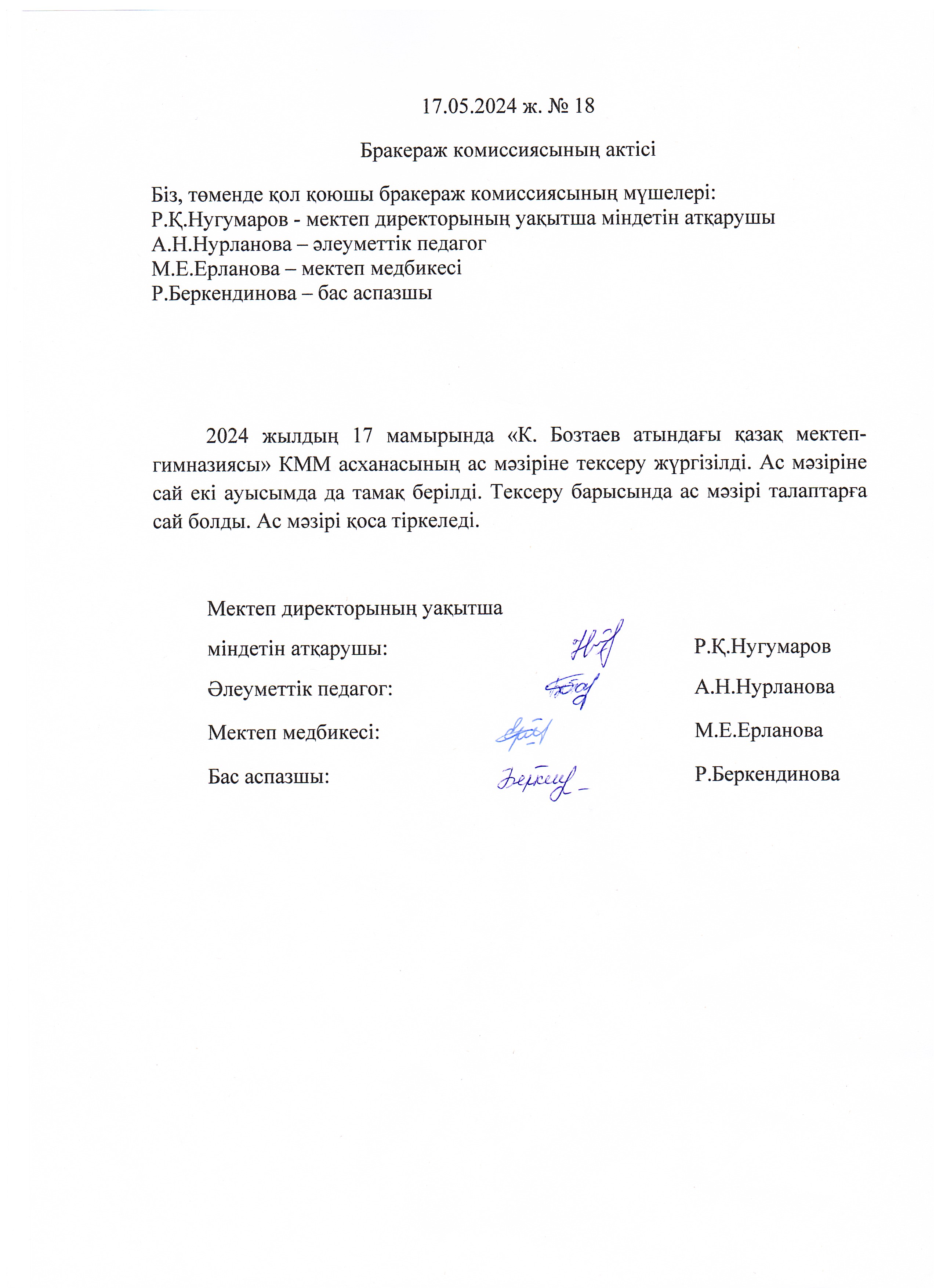 2024 жылдың 17 мамырында «К. Бозтаев атындағы қазақ мектеп-гимназиясы» КММ асханасының ас мәзіріне тексеру жүргізілді. Ас мәзіріне сай екі ауысымда да тамақ берілді. Тексеру барысында ас мәзірі талаптарға сай болды. Ас мәзірі қоса тіркеледі.