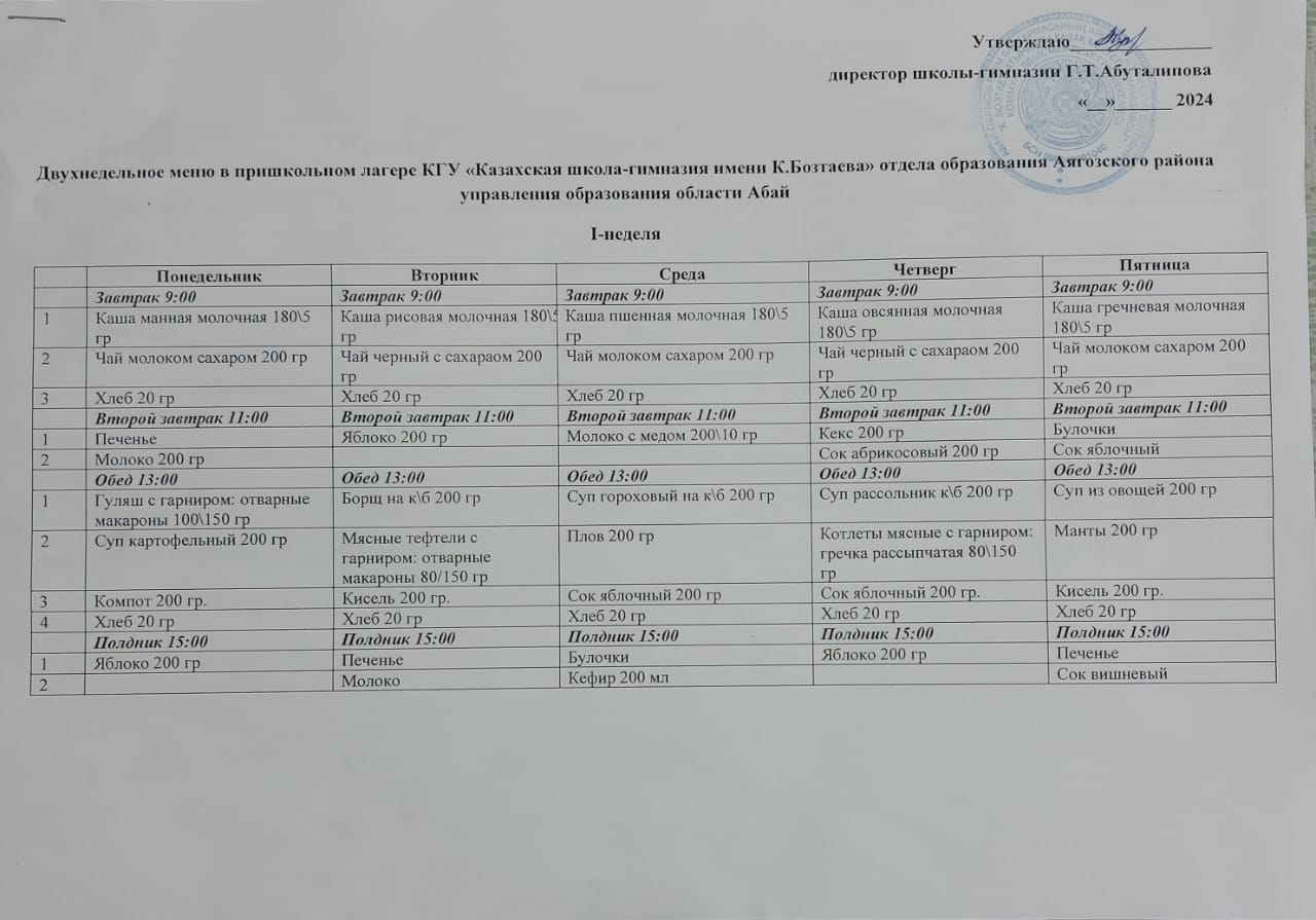 «К. Бозтаев атындағы қазақ мектеп-гимназиясы» КММ асханасының ас мәзіріне тексеру жүргізілді. Ас мәзіріне сай төрт уақыт оқушыларға тамақ берілді. Тексеру барысында ас мәзірі талаптарға сай болды. Ас мәзірі қоса тіркеледі.