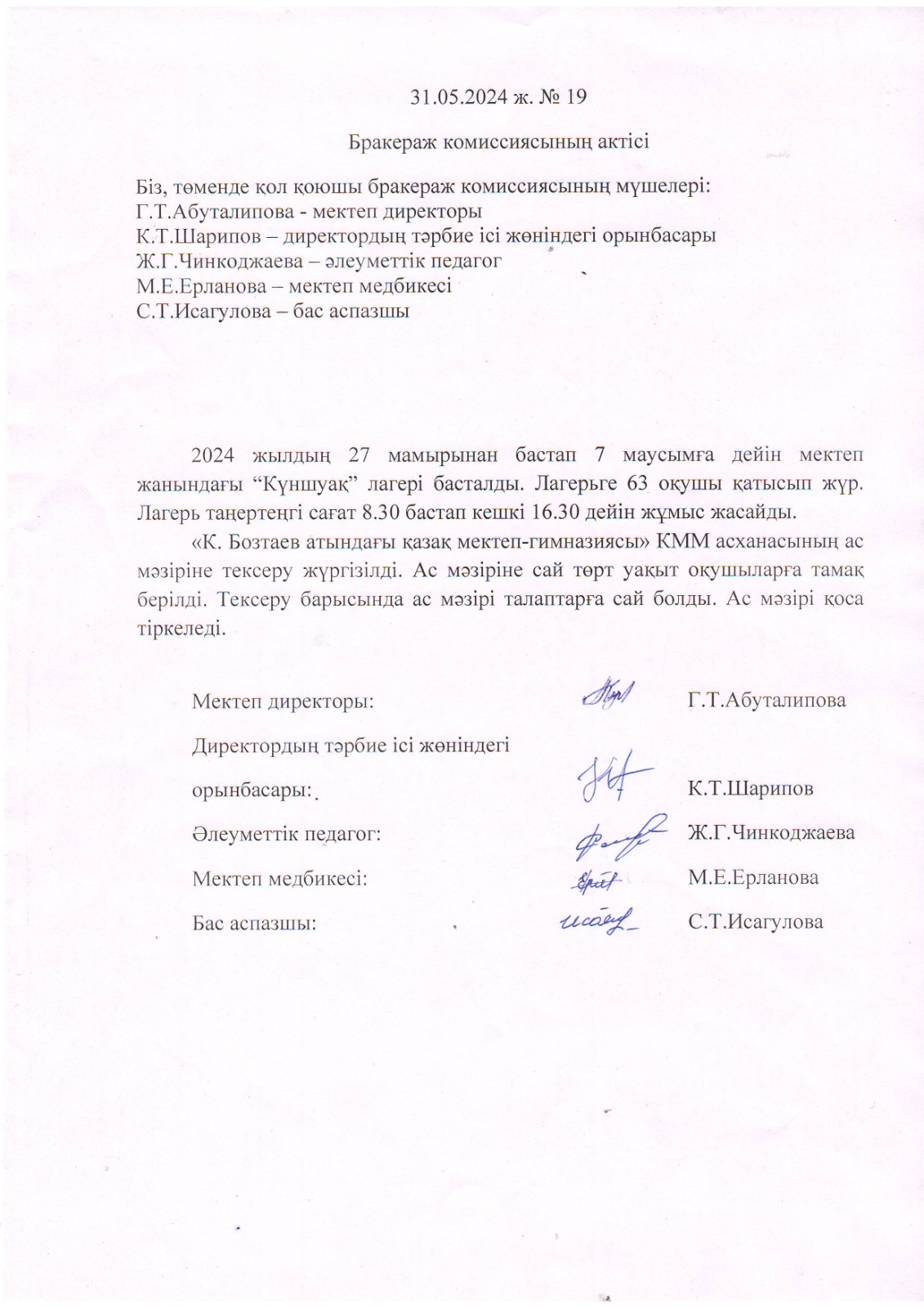 2024 жылдың 27 мамырынан бастап 7 маусымға дейін мектеп жанындағы “Күншуақ” лагері басталды.