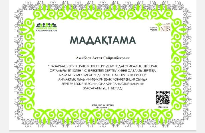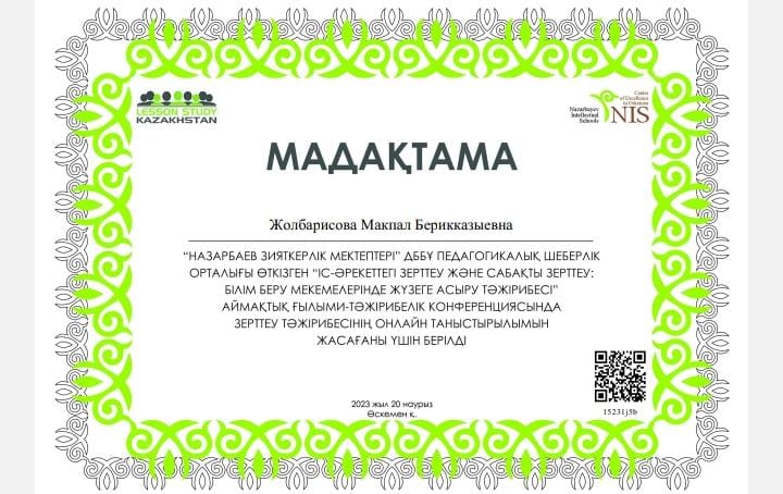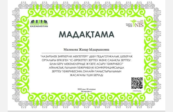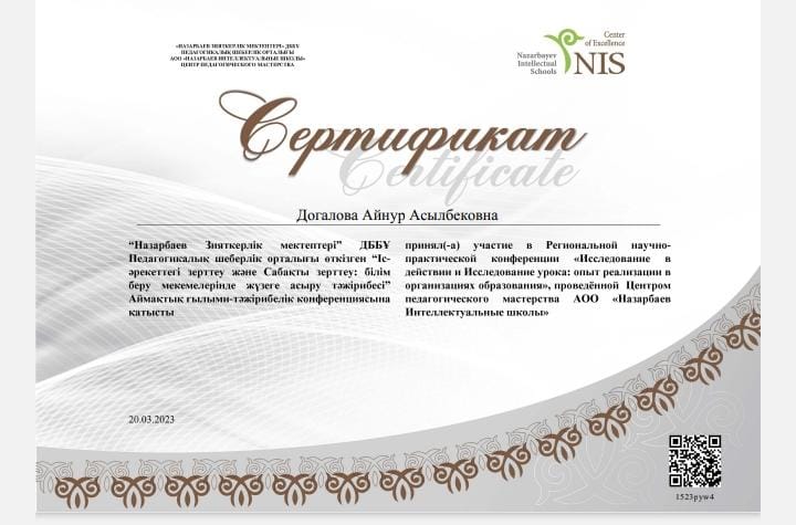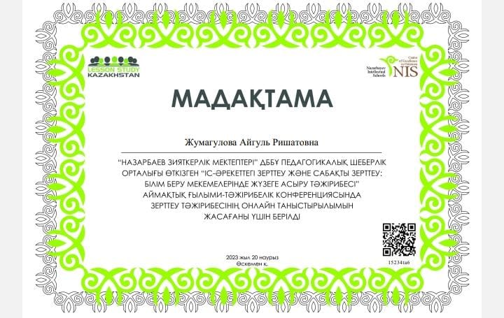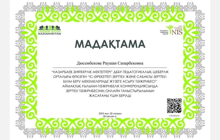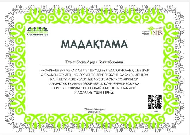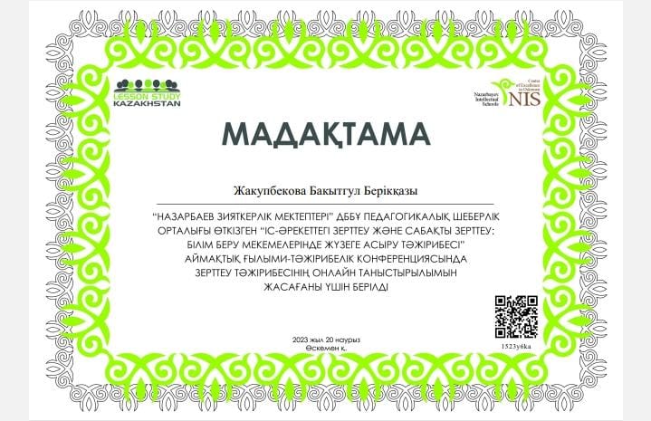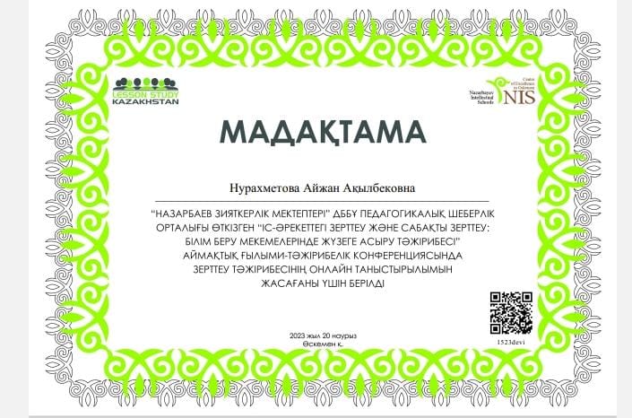 2022-2023 оқу жылы бойынша сабақтарға зерттеулер жасап, "Іс әрекеттегі зерттеу және сабақты зерттеу : Білім беру мекемелерінде жүзеге асыру тәжірибесі» атты аймақтық конференцияға қатысып,өз тәжірибелерімен бөлісті.Құттықтаймыз!