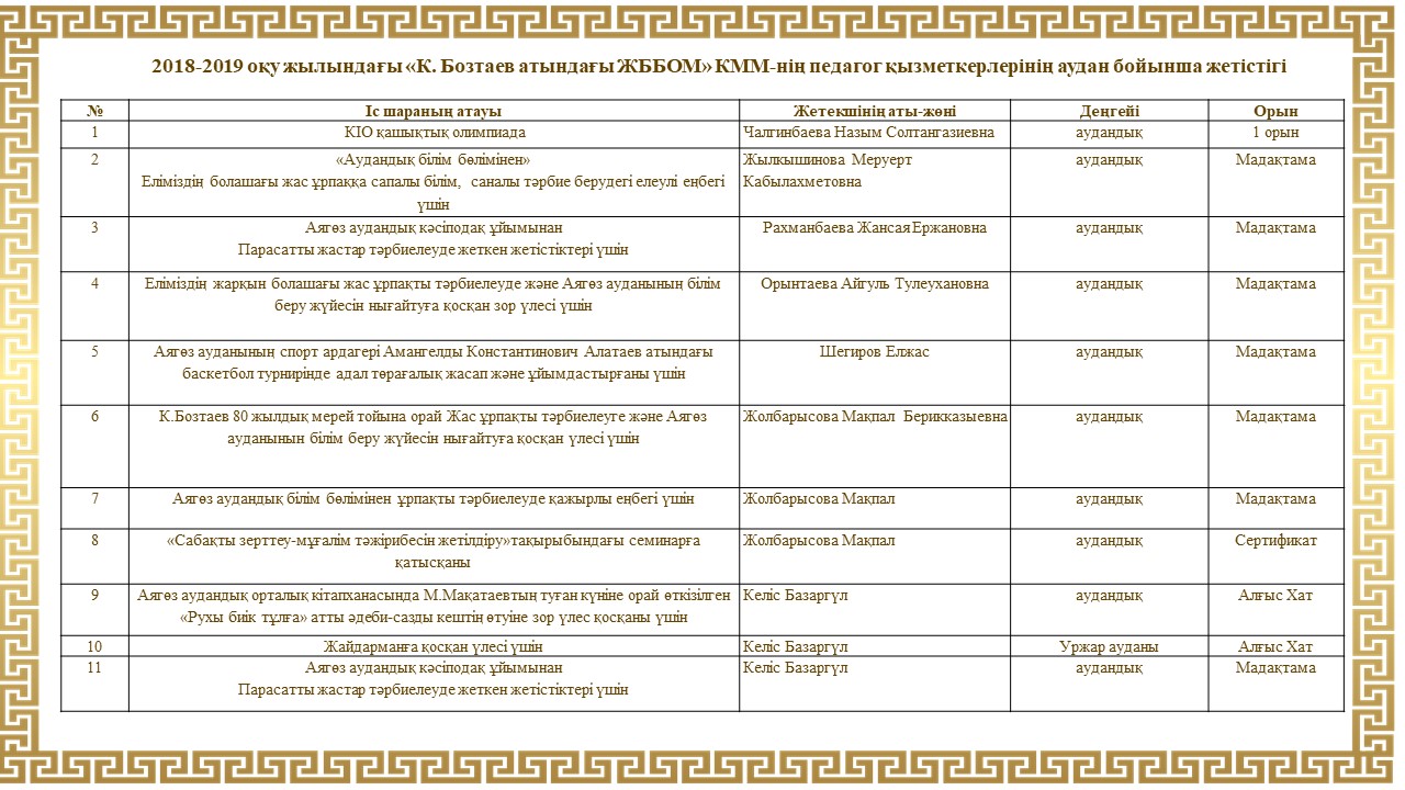 2018-2019 оқу жылындағы «К. Бозтаев атындағы ЖББОМ» КММ-нің педагог қызметкерлерінің аудан бойынша жетістігі