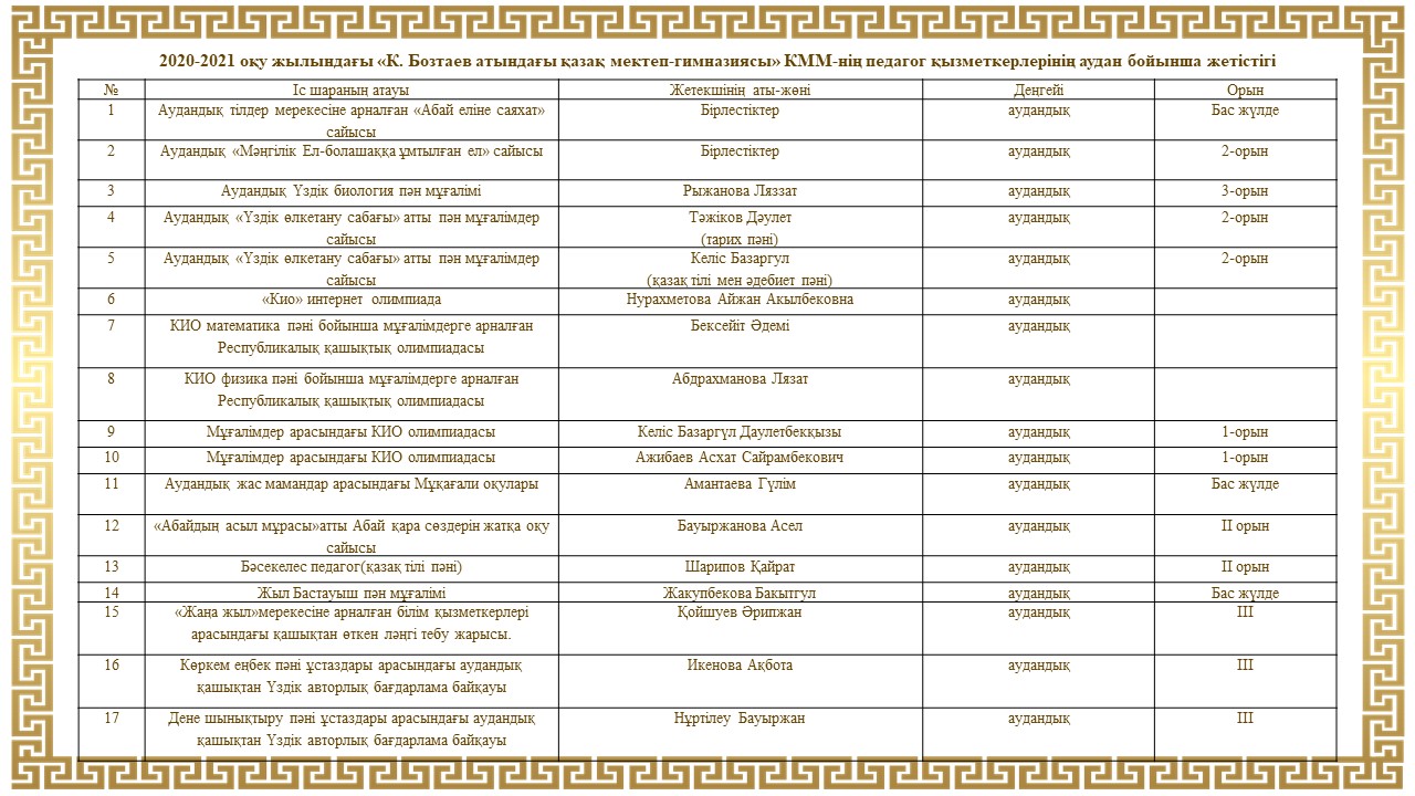 2020-2021 оқу жылындағы «К. Бозтаев атындағы қазақ мектеп-гимназиясы» КММ-нің педагог қызметкерлерінің аудан бойынша жетістігі