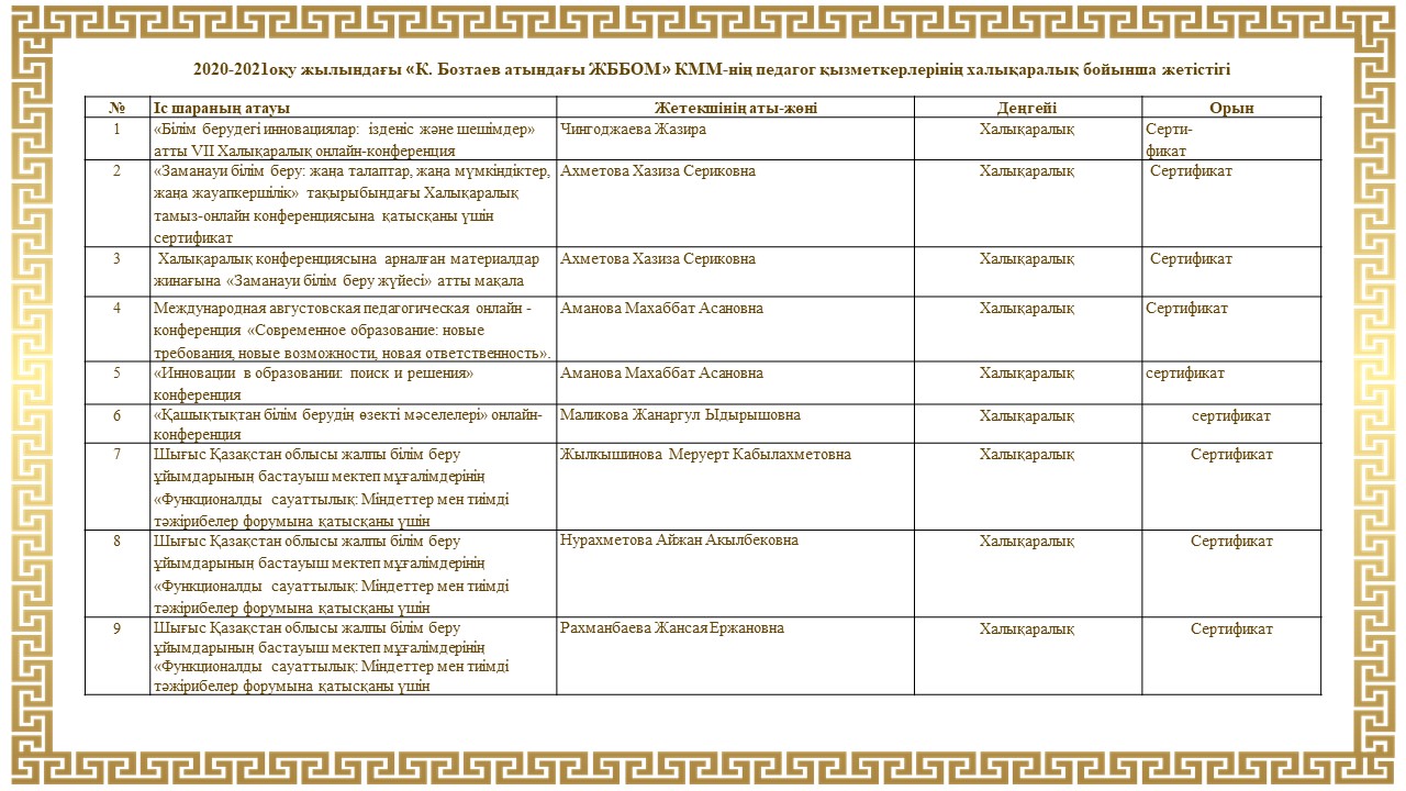 2020-2021оқу жылындағы «К. Бозтаев атындағы ЖББОМ» КММ-нің педагог қызметкерлерінің халықаралық бойынша жетістігі