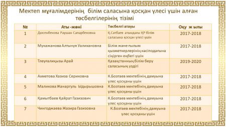 Мектеп мұғалімдерінің білім саласына қосқан үлесі үшін алған төсбелгілерінің тізімі