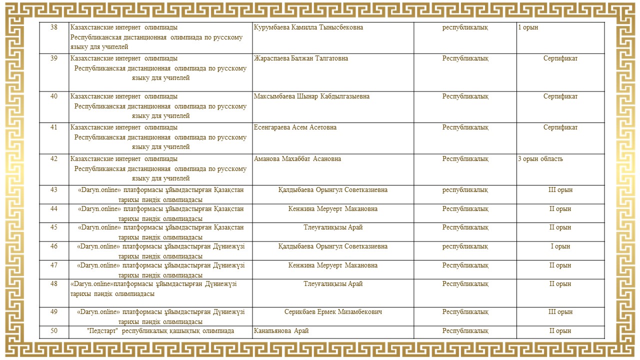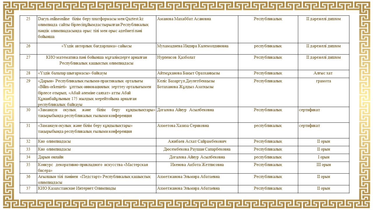2020-2021оқу жылындағы «К. Бозтаев атындағы ЖББОМ» КММ-нің педагог қызметкерлерінің республика бойынша жетістігі
